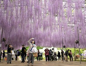 足利市迫間(はさま)町のあしかがフラワーパークで、県天然記念物に指定されている樹齢160年超の大藤が見頃を迎え、多くの来場者でにぎわっています。